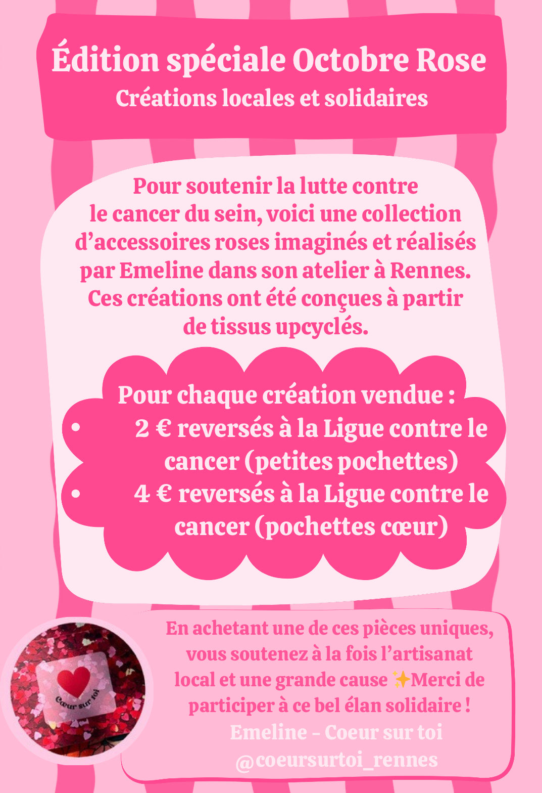 Pour chaque création vendue , 2€ ( petite pochette ) & 4€ ( pochette cœur ) sont reversés à la ligue contre le cancer du sein 🩷