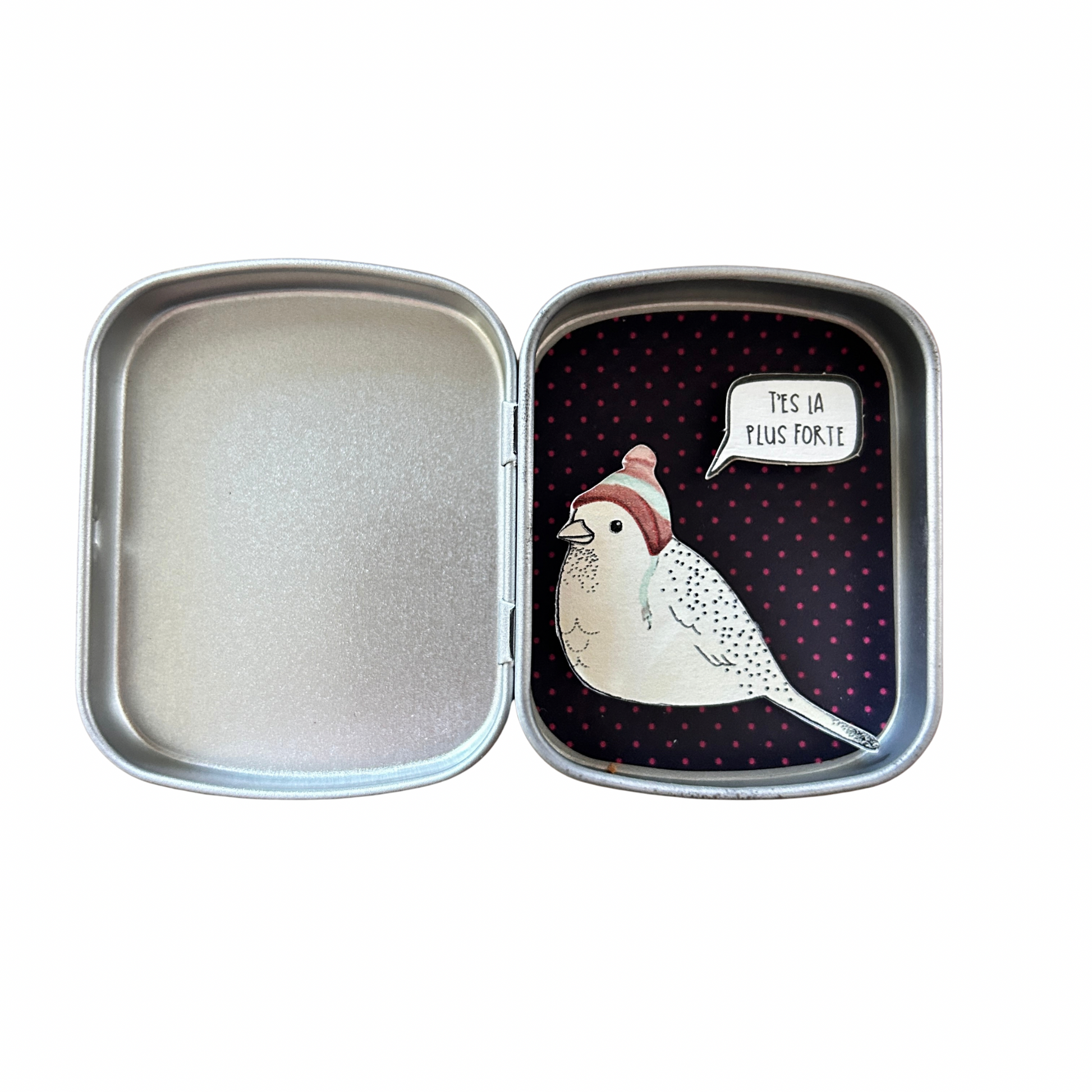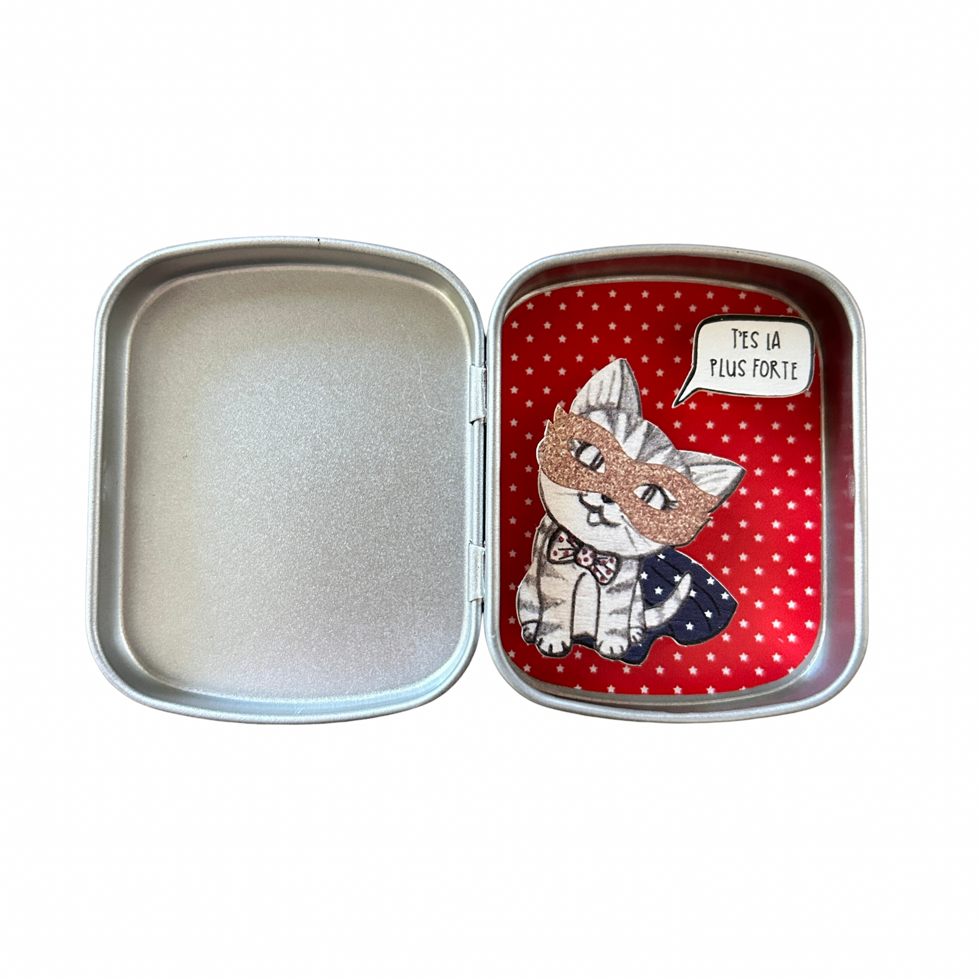 Chaque boîte est unique, avec son illustration en papier et son mot doux personnalisé. Compacte et légère, elle se glisse facilement dans un cartable, un sac ou une poche pour être emportée partout.