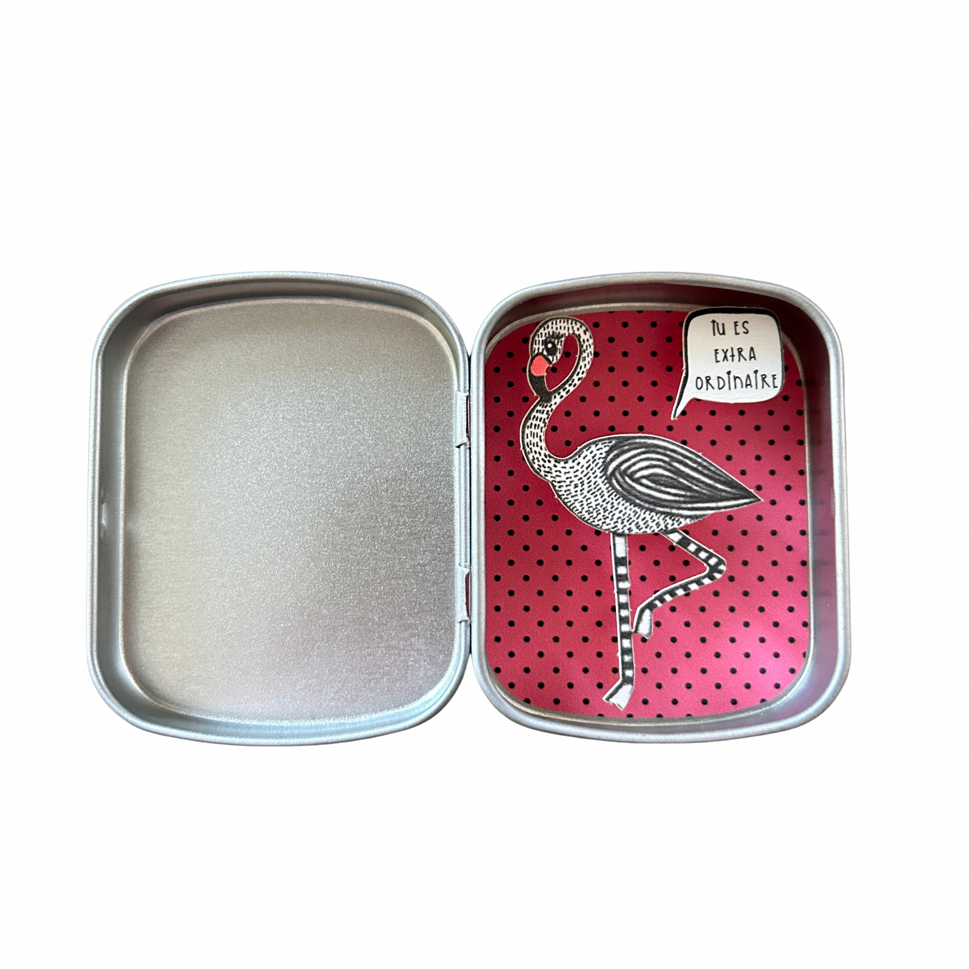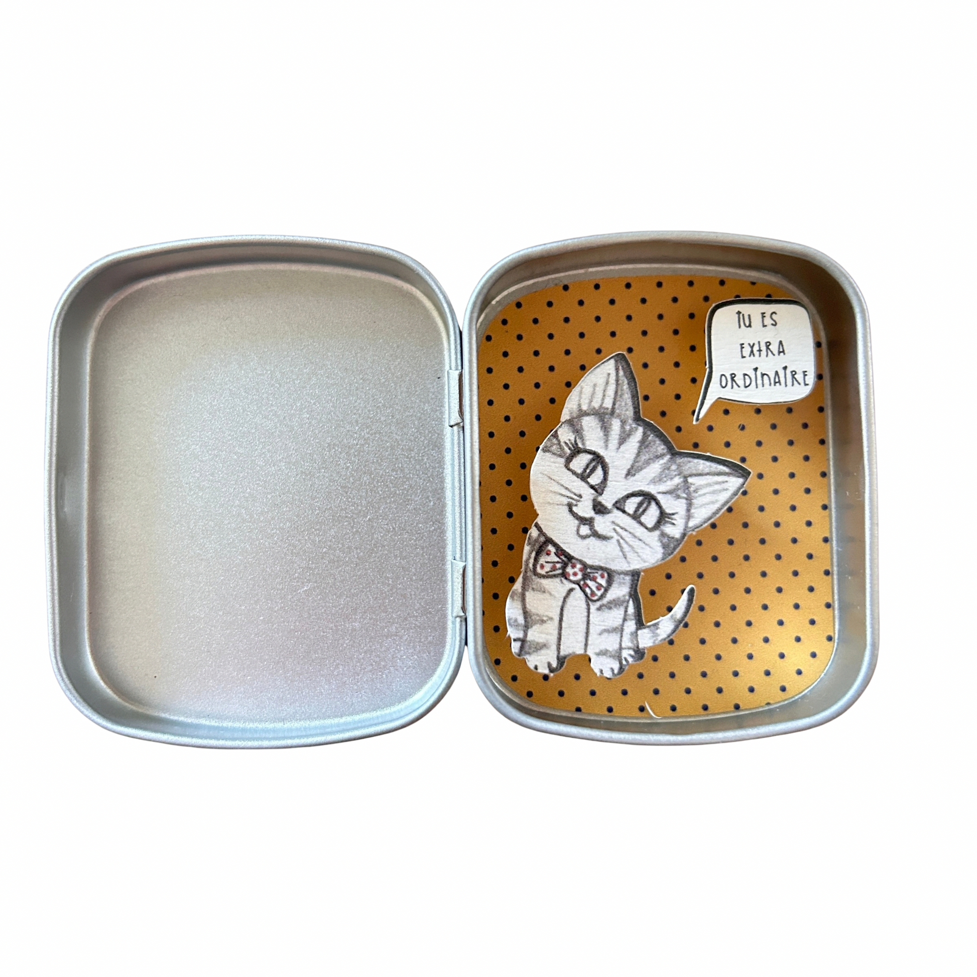 Chaque boîte est unique, avec son illustration en papier et son mot doux personnalisé. Compacte et légère, elle se glisse facilement dans un cartable, un sac ou une poche pour être emportée partout.