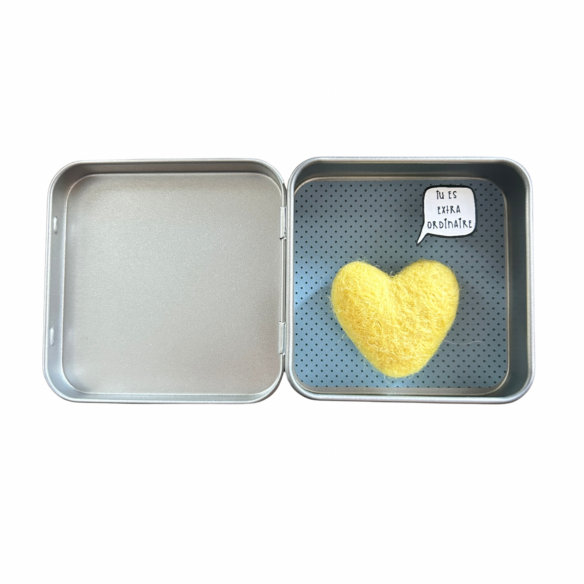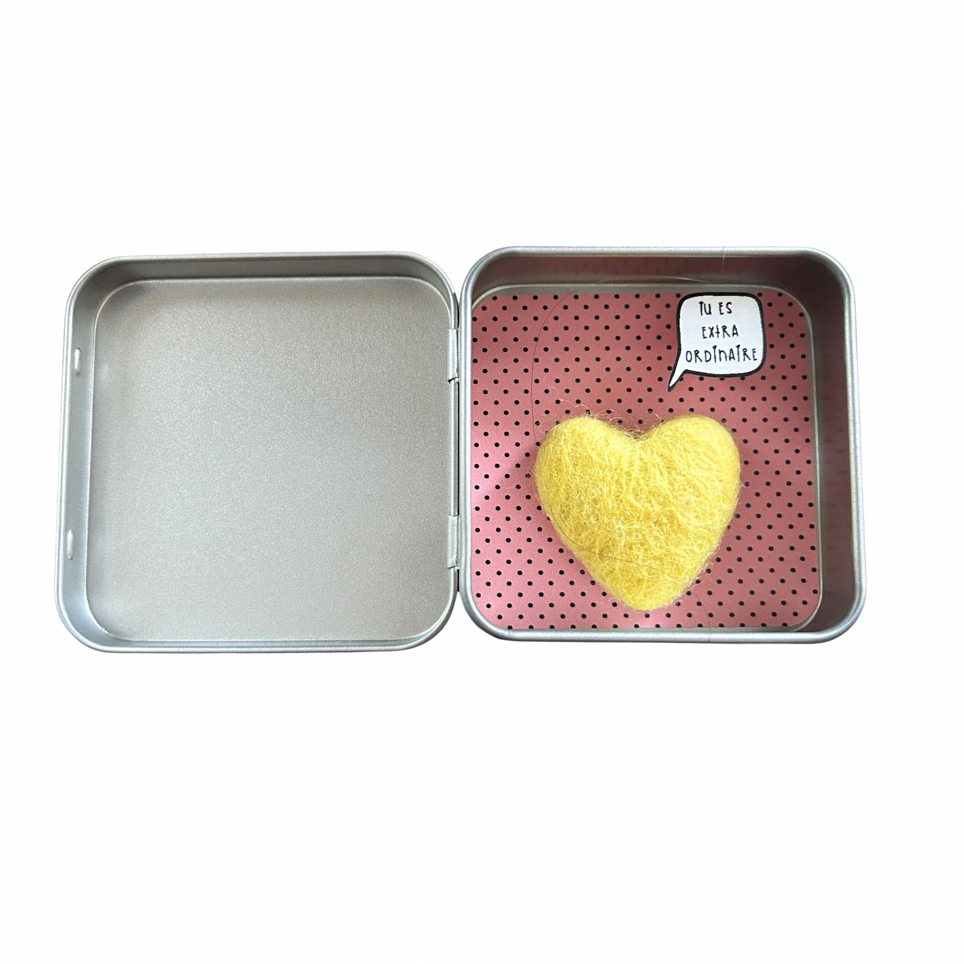 Chaque boîte est unique, avec son personnage ou cœur et son mot doux personnalisé. Compacte et légère, elle se glisse facilement dans un cartable, un sac ou une poche pour être emportée partout.