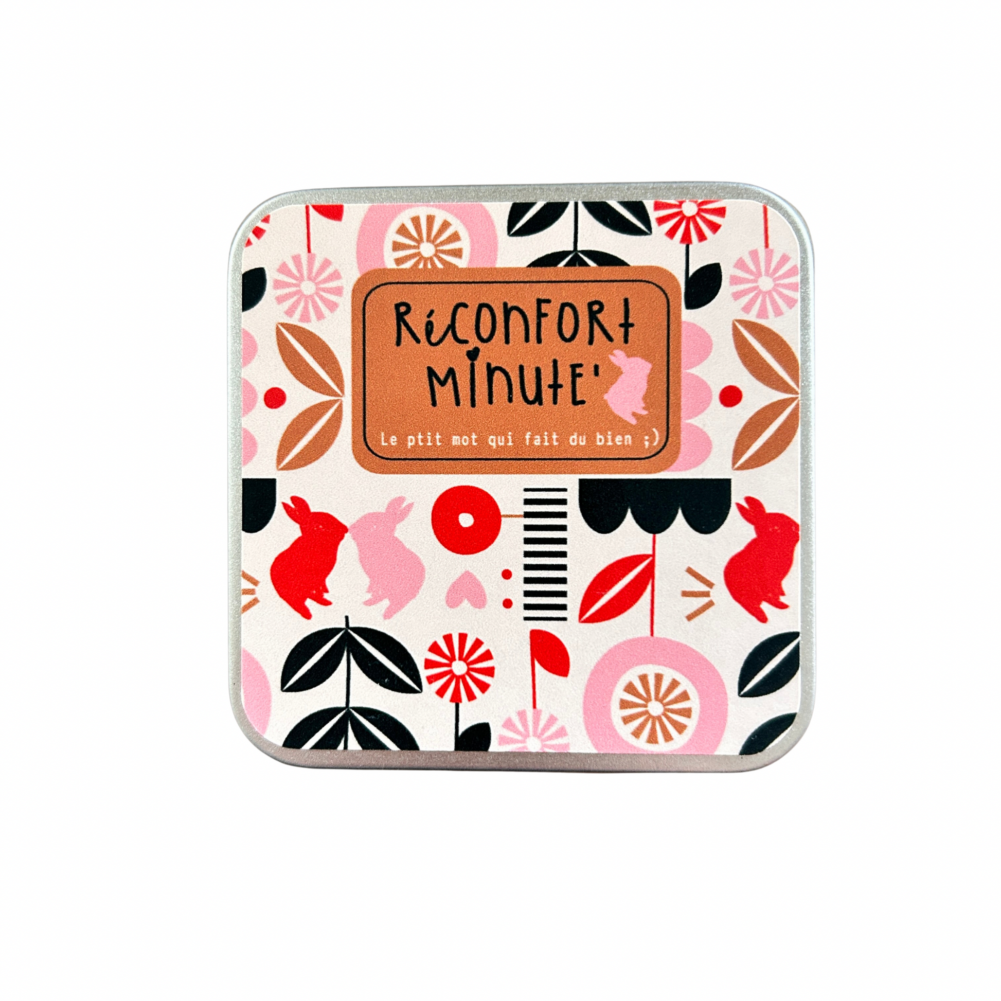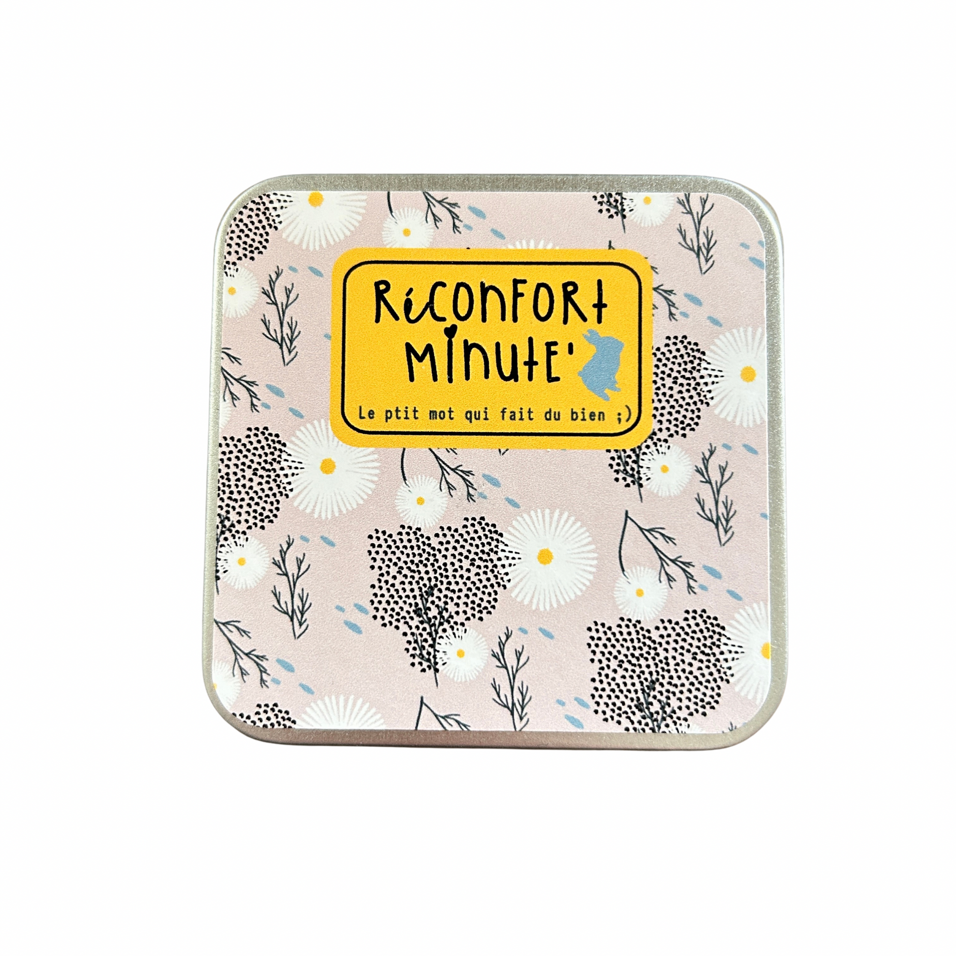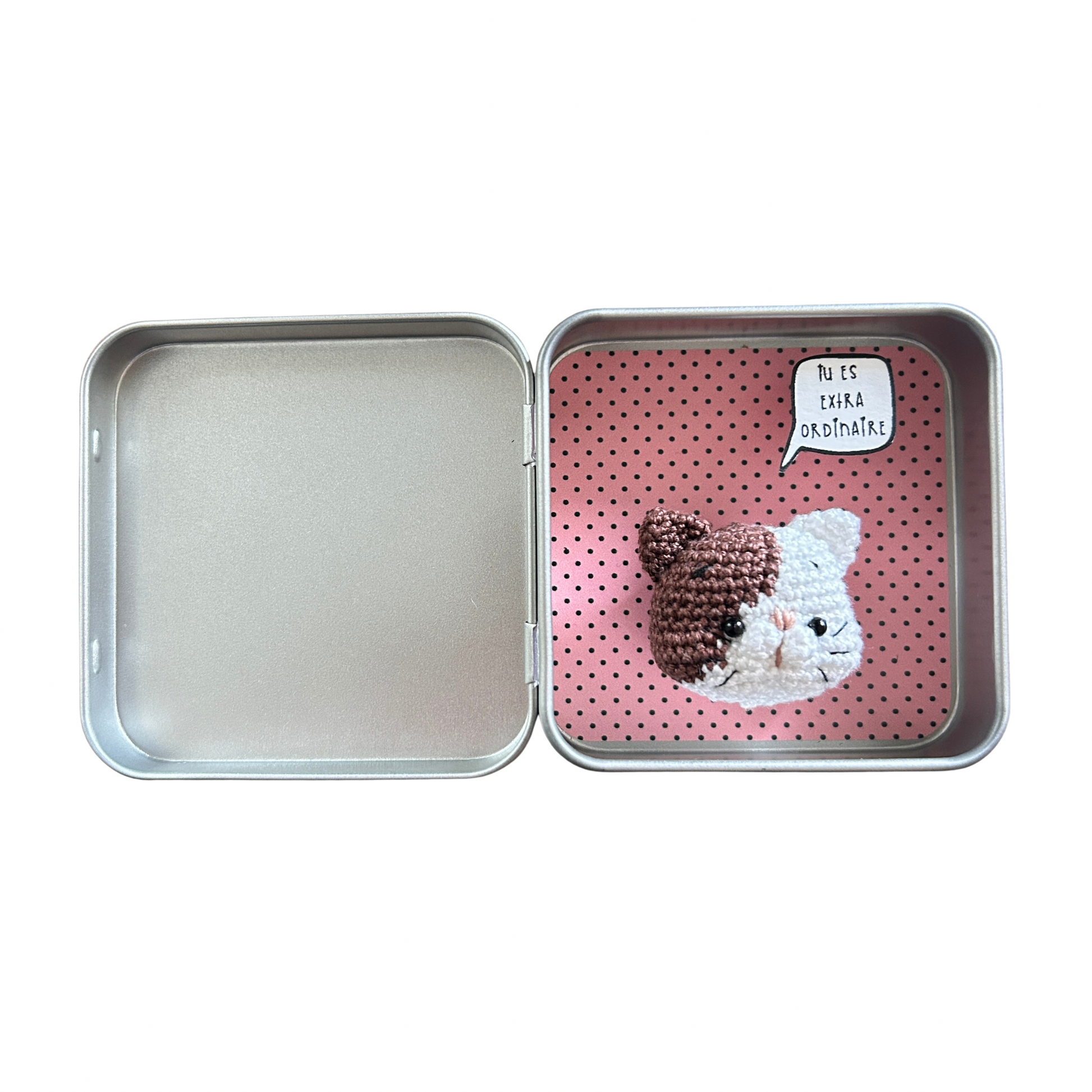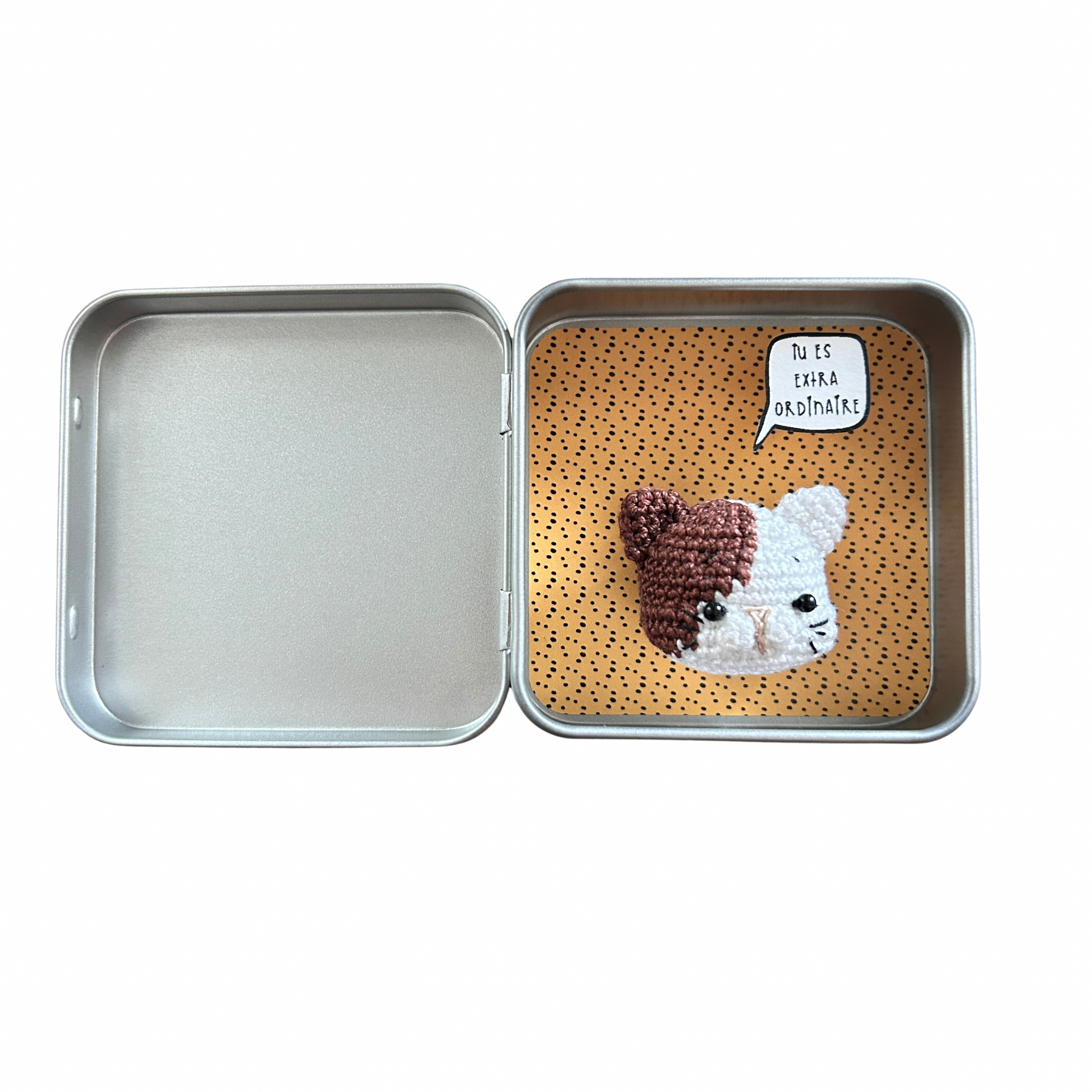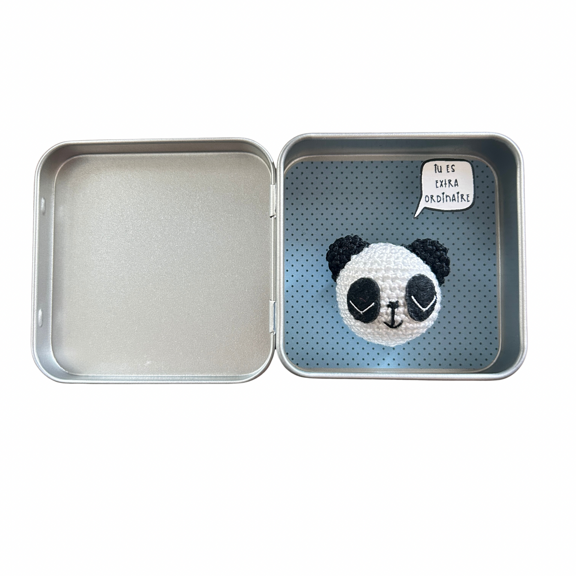 La boîte de réconfort minute est une jolie boîte en fer blanc, contenant un petit personnage en crochet ou laine cardée accompagné d’un message tendre et bienveillant.