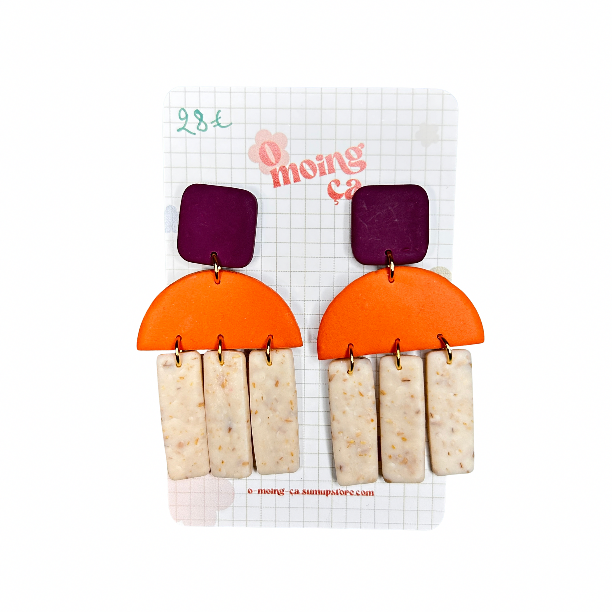 - Boucles en trois parties : carré chocolat, demi-cercle orange, trois rectangles marbrés