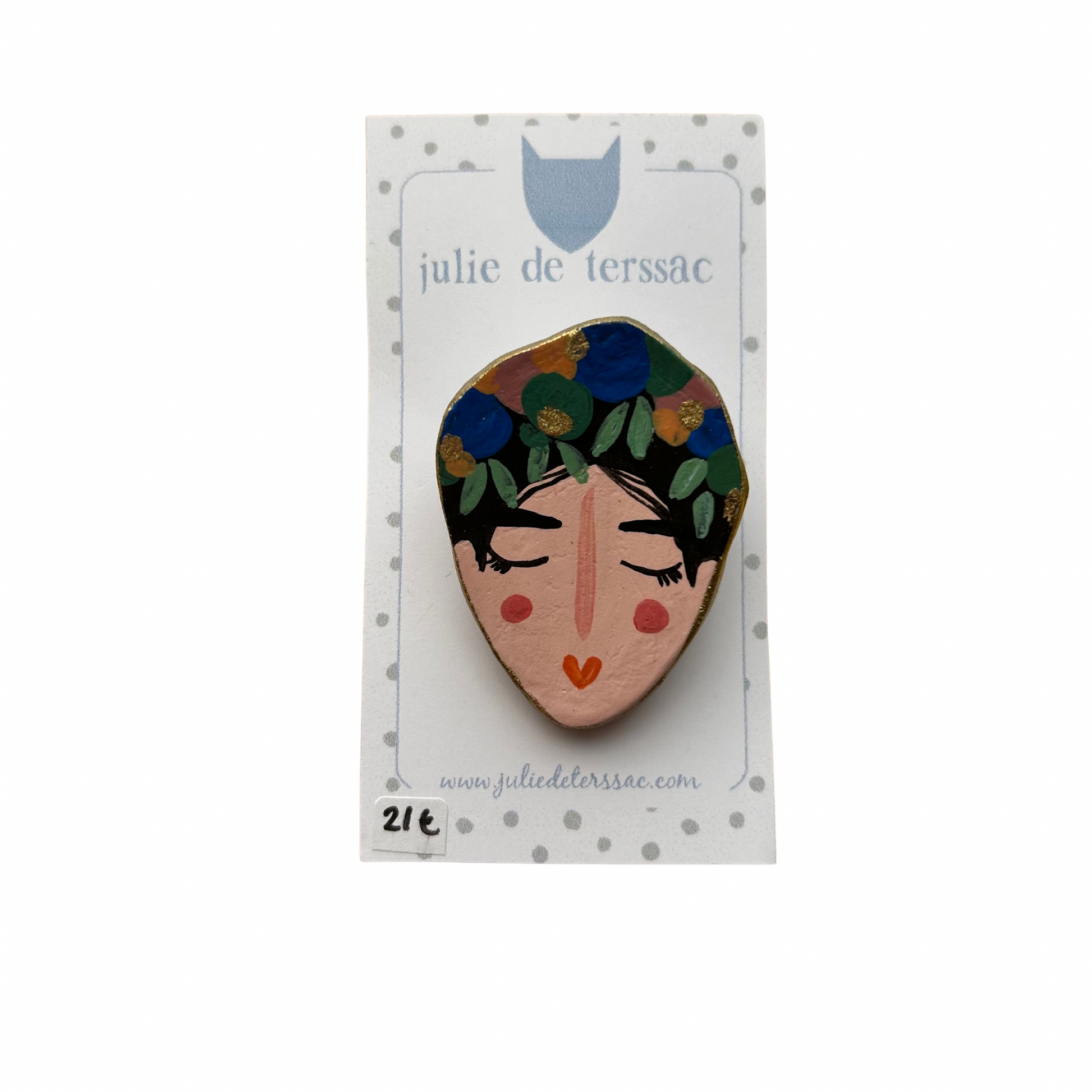 Cette broche en argile peinte à la main est un hommage à l'artiste mexicaine Frida Kahlo.