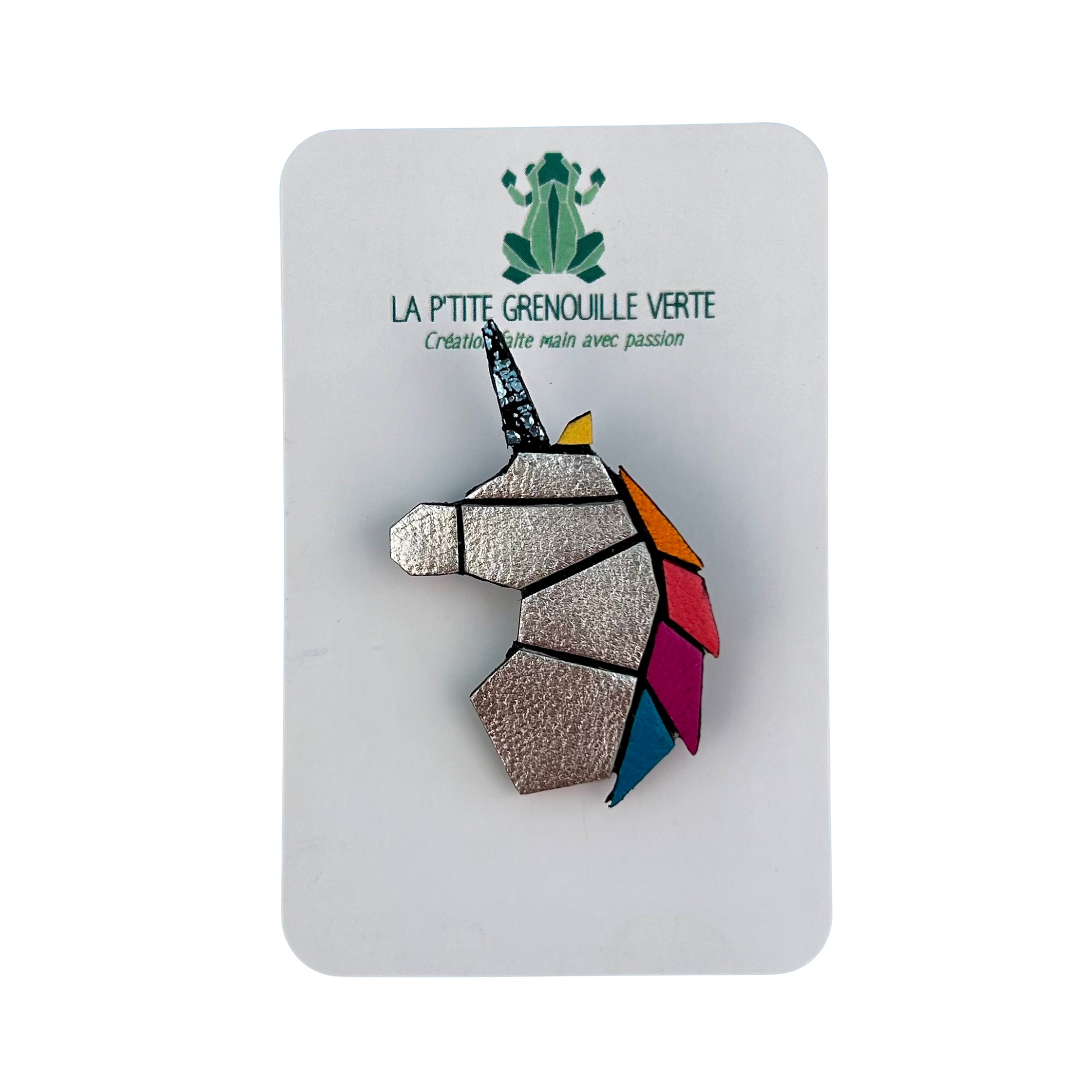 La broche Licorne La p'tite grenouille verte est un accessoire élégant et original en cuir véritable et laiton. Son design inspiré de l'origami en fait un ajout unique à votre garde-robe. Fabriquée avec soin, cette broche apportera une touche de fantaisie à toutes vos tenues.