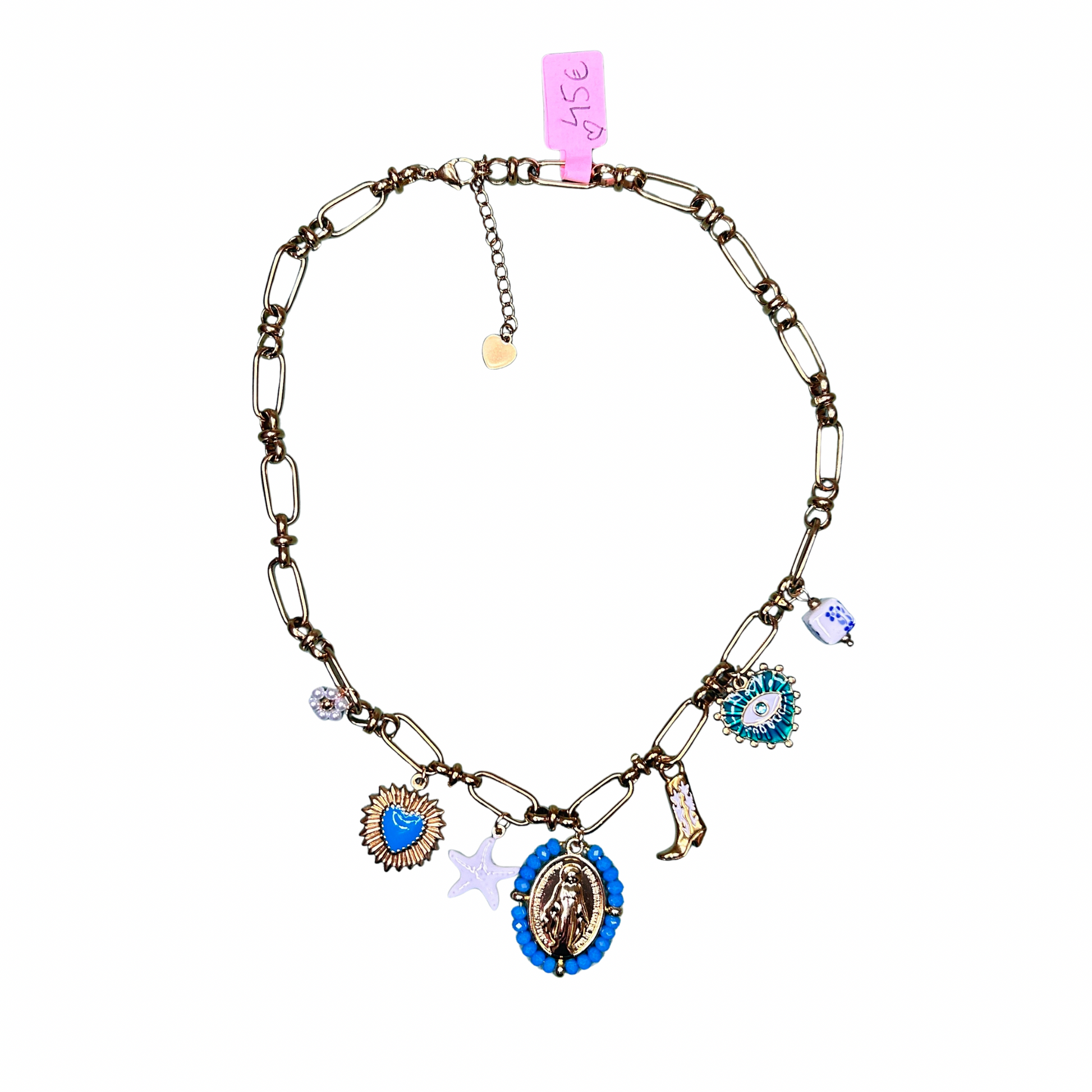 Chaque modèle est composé d’une chaîne dorée en acier inoxydable de taille standard, résistante et élégante, agrémentée de pendentifs colorés et originaux : médailles, cœurs, étoiles de mer, perles, symboles porte-bonheur et bien plus encore 💙🌸⭐.